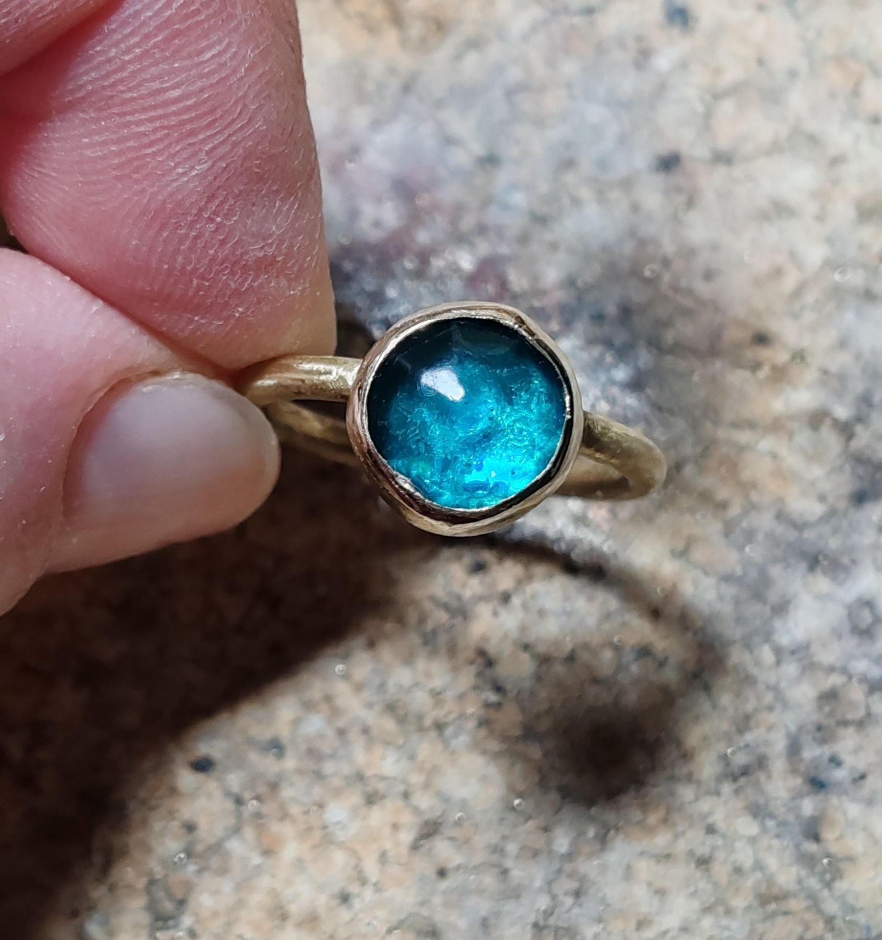 Ti mando le foto del mio primo anello con incastonatura... lo so che è lontanissimo dall'essere perfetto (non è un cerchio, non è liscio e non è saldato benissimo, in più il gambo non è centrato...) ma è stato tutto fatto per la prima volta, anche la legatura!!! In più il cabochon l'ho fatto io con la resina... però devo dirti che sono felicissima, continuo a guardarlo ed a dirmi: "L'HO FATTO IO!!!"